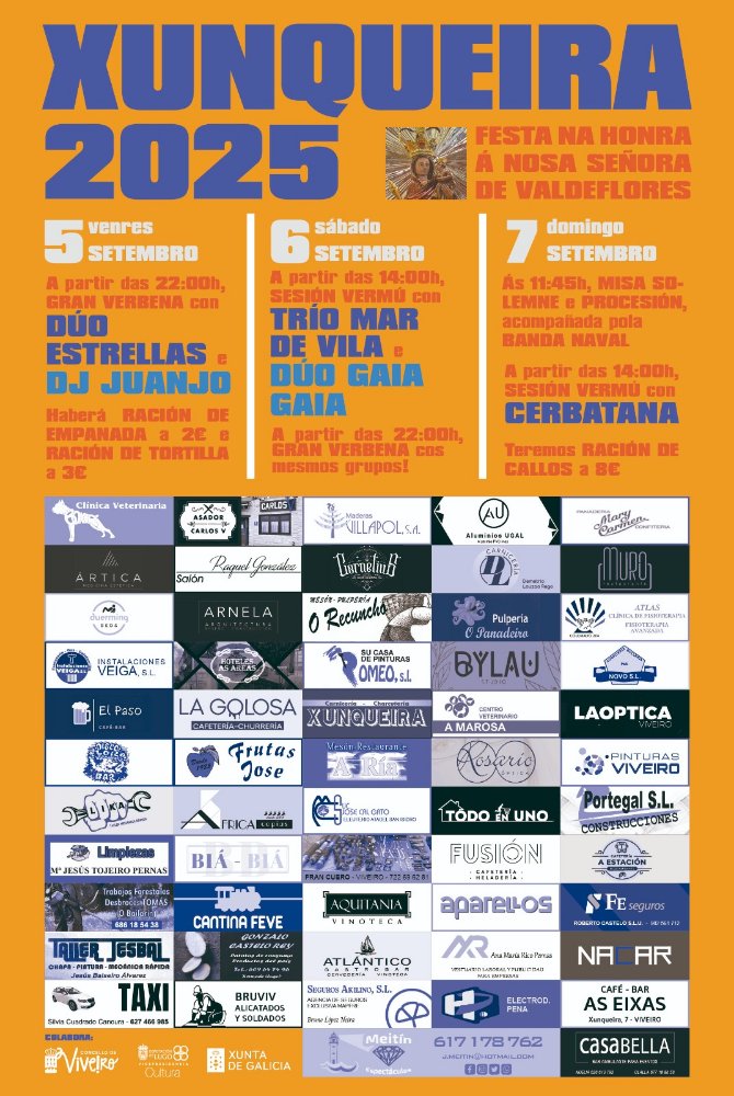 Les compartimos el cartel de fiestas de Xunqueira 2025, recordar que el Dúo Cerbatana Show estamos en sesión vermut y que dura hasta que el cuerpo aguante... Pues si porque en Viveiro la fiesta siempre es larga y muy animada.